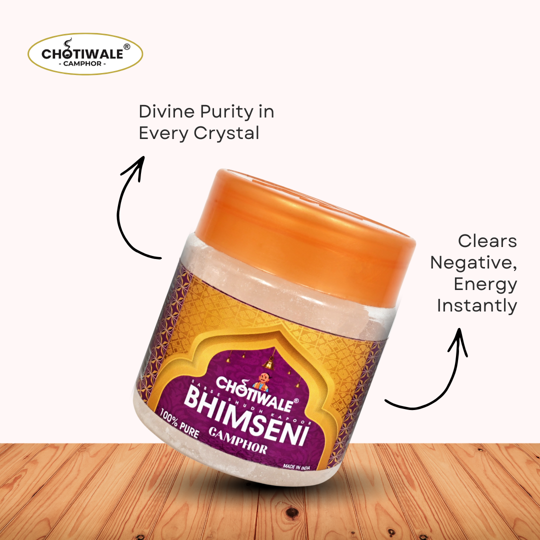 Chotiwale Bhimseni Camphor is a premium quality pure Bhimseni (Desi) camphor specially used for puja, meditation, aromatherapy, and spiritual rituals. Known for its strong natural fragrance and clean burning properties, Bhimseni camphor helps create a pure, peaceful, and divine atmosphere during prayers and spiritual practices.